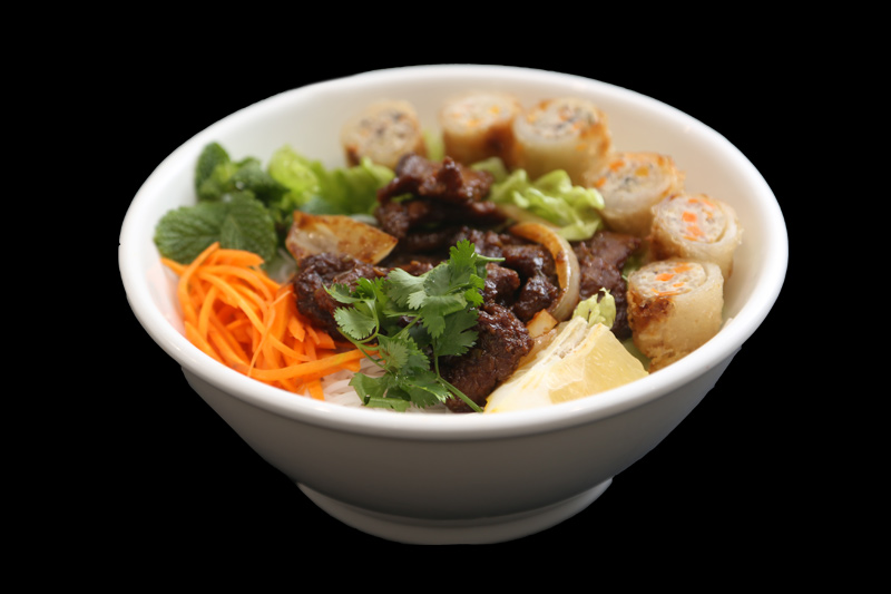 Boeuf grillé à la citronnelle avec nêms et vermicelle et salade soja