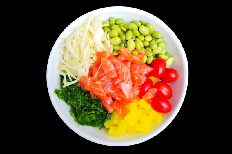 Saumon,tomate,radis jaune,edamamé,salade de choux,salade d'algue,sur un riz vinaigré,offert 1 soupe miso.
