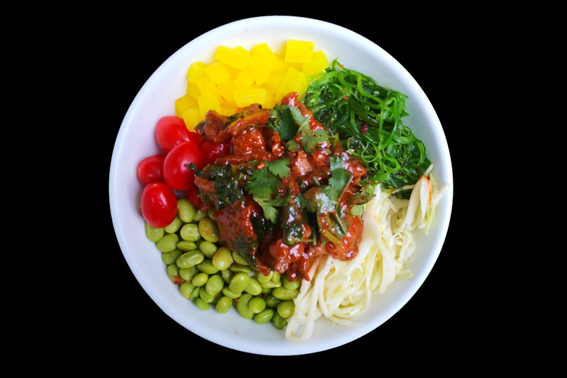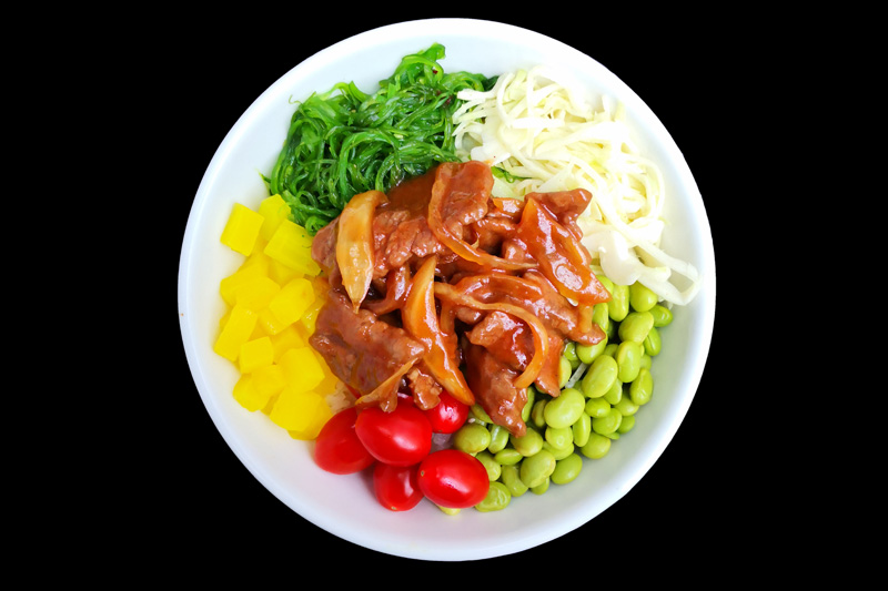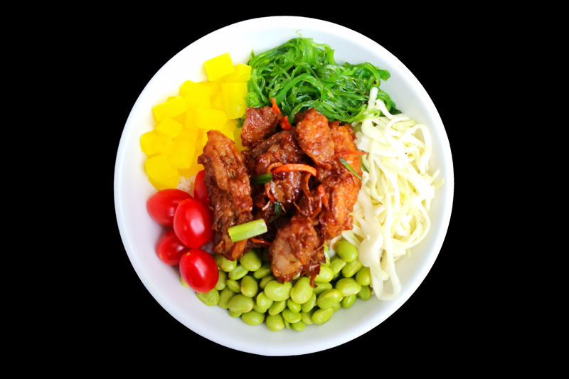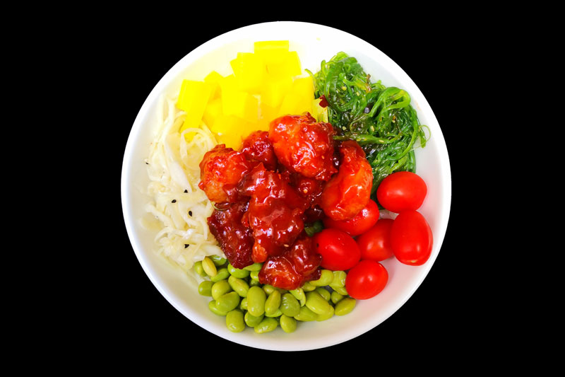 poulet caramel,tomate,radis jaune,edamamé,salade de choux,salade d'algue,sur un riz nature,offert 1 soupe miso.