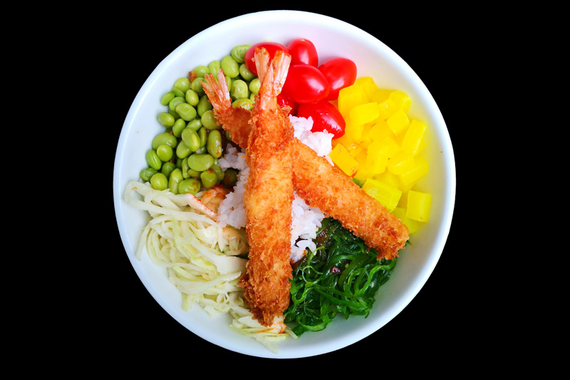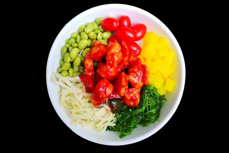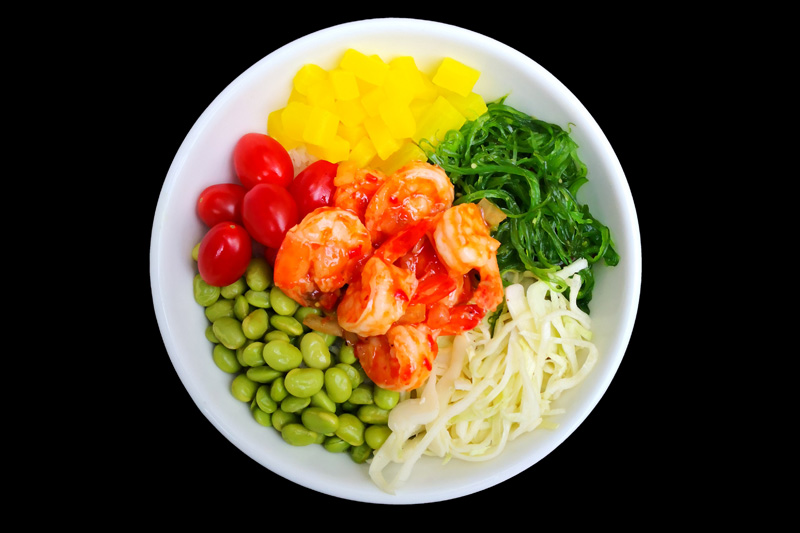 crevette sauté sauce piquante,tomate,radis jaune,edamamé,salade de choux,salade d'algue,sur un riz vinaigre,offert 1 soupe miso.