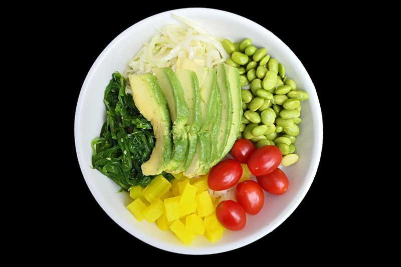 Avocat,tomate,radis jaune,edamamé,salade de choux,salade d'algue,sur un riz vinaigré,offert 1 soupe miso.
