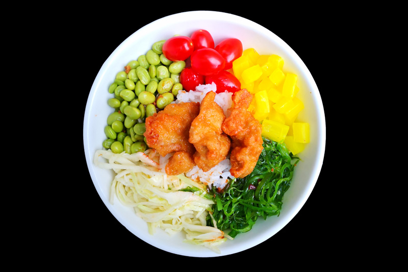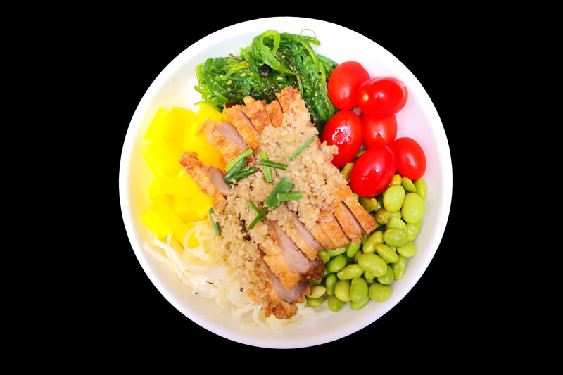 poulet panné,tomate,radis jaune,edamamé,salade de choux,salade d'algue,sur un riz vinaigré,offert 1 soupe miso.